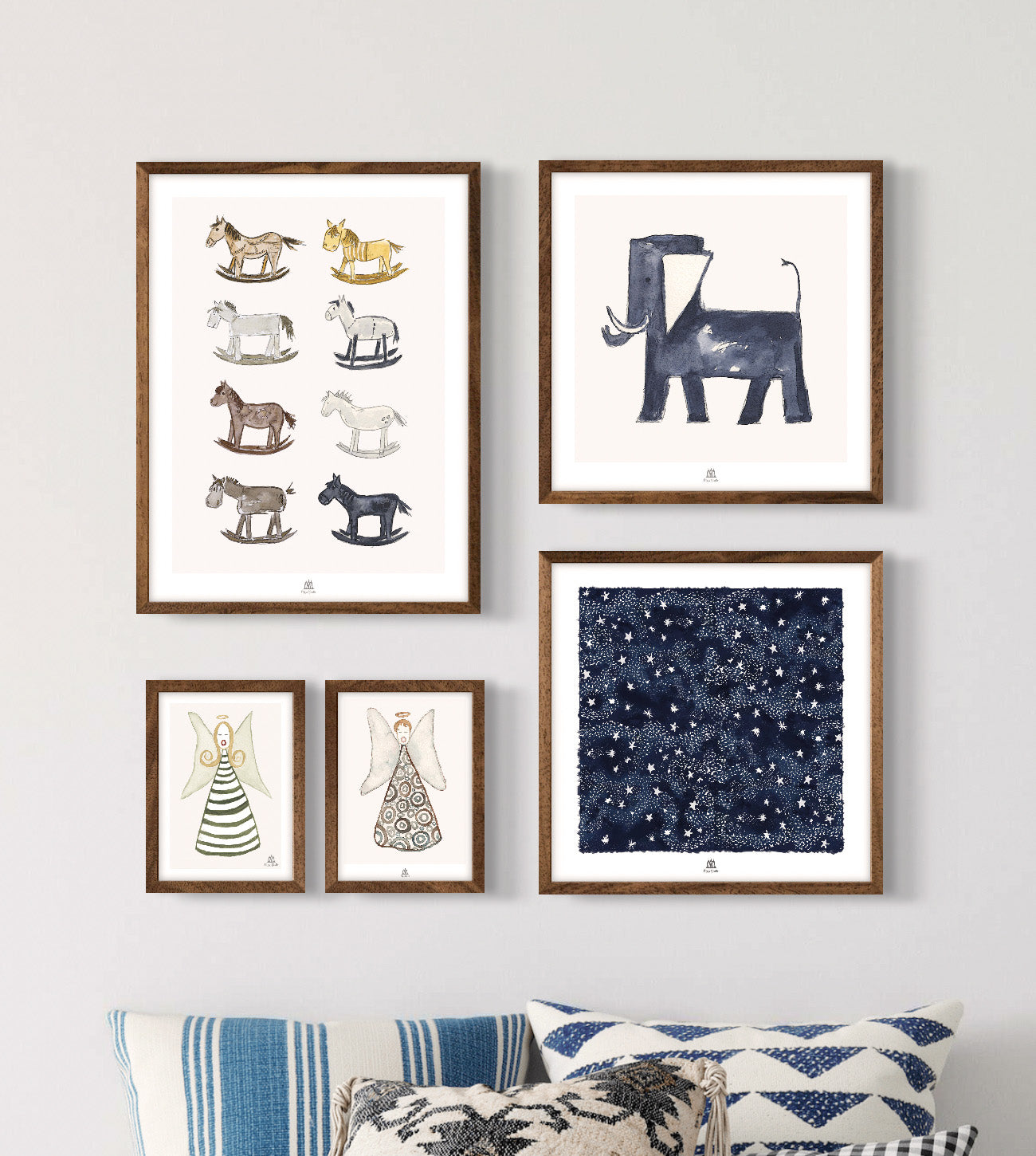 Storlek: Gunghästar 40x30 cm, Blå elefant 30x30 cm, Vintergatan 30x30 cm, Ängel Glipp 18x13 cm och Ängel Glica 18x13 cm.