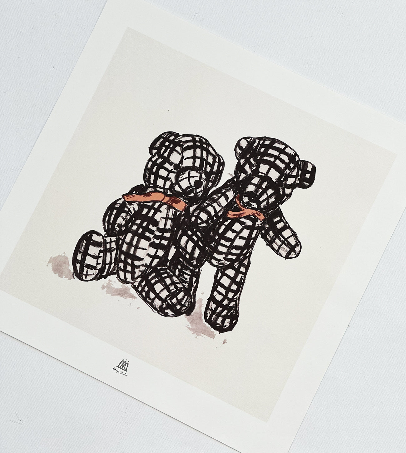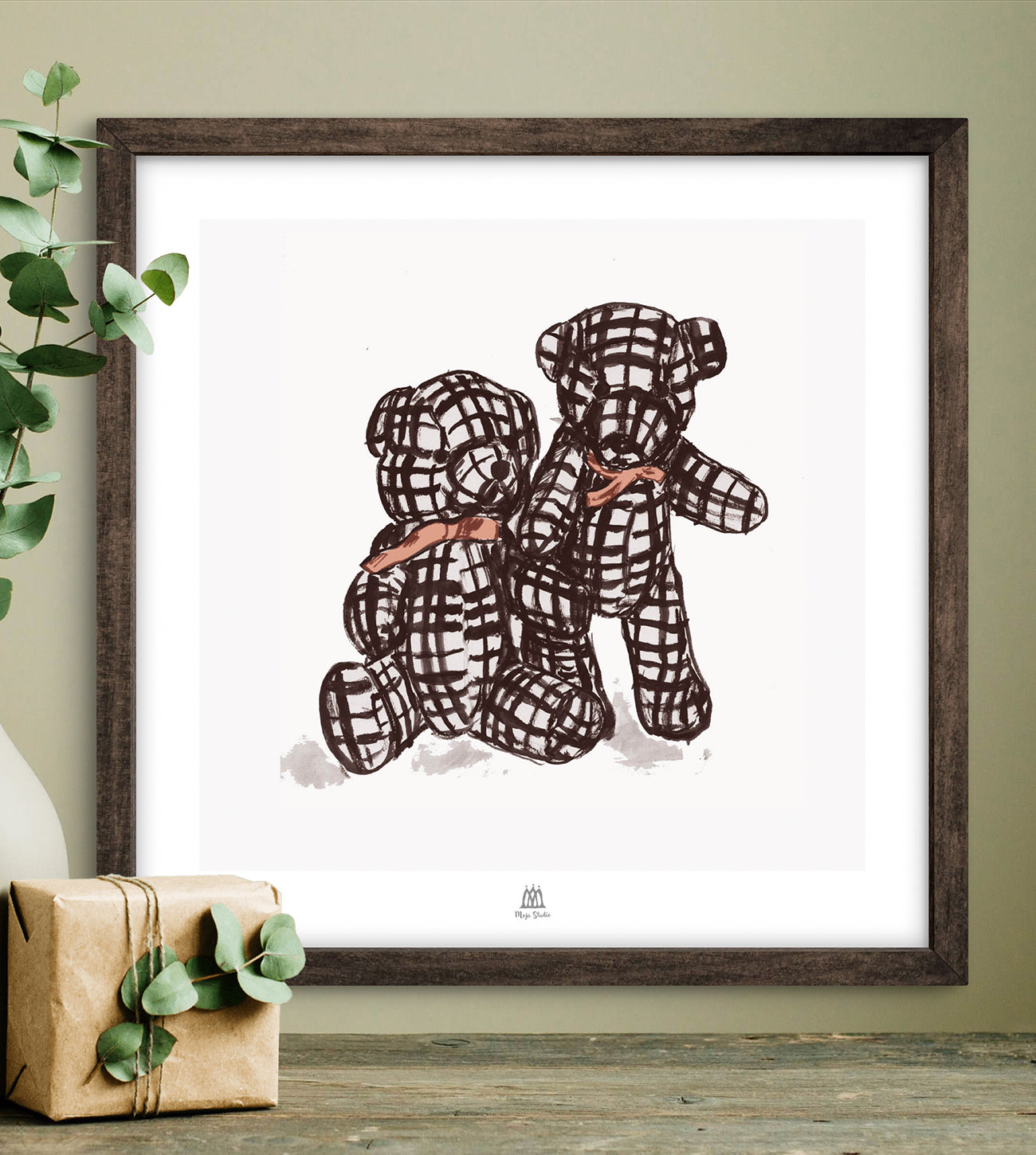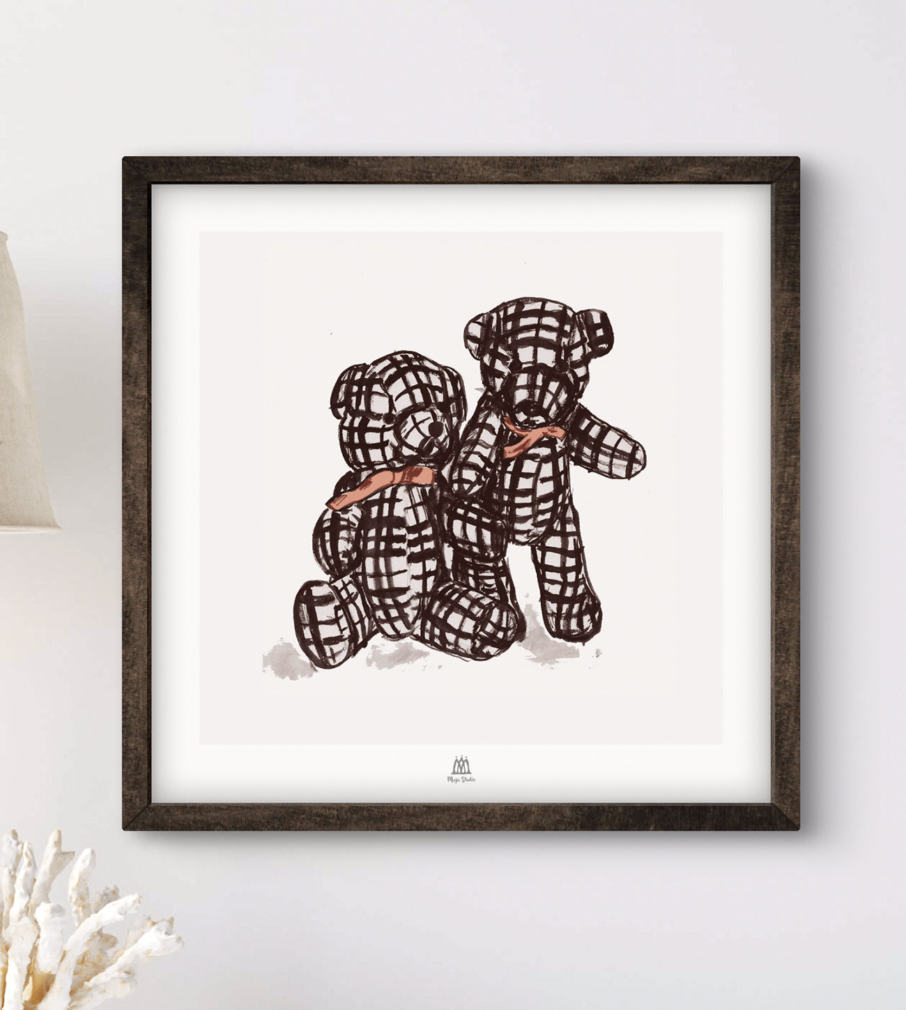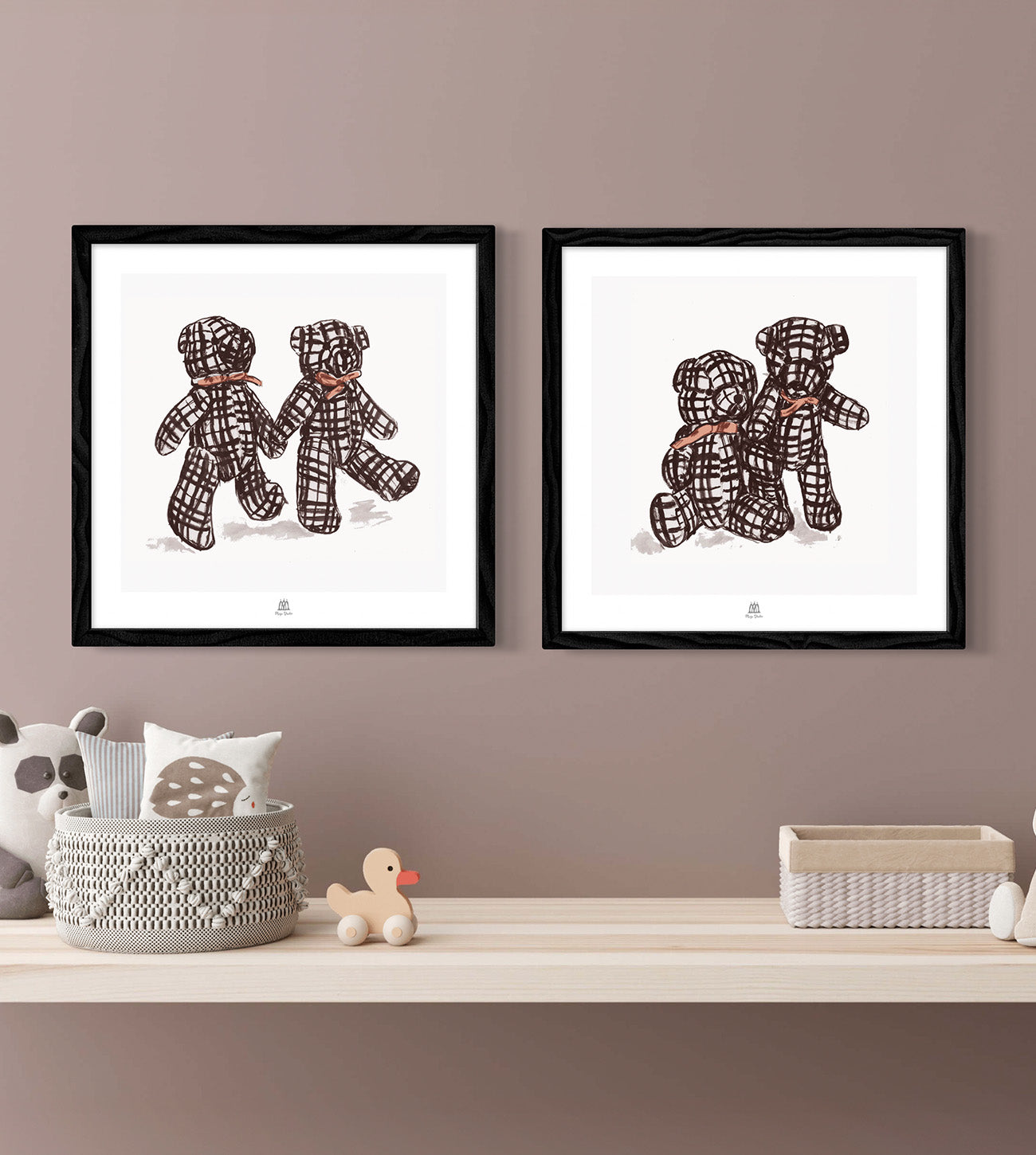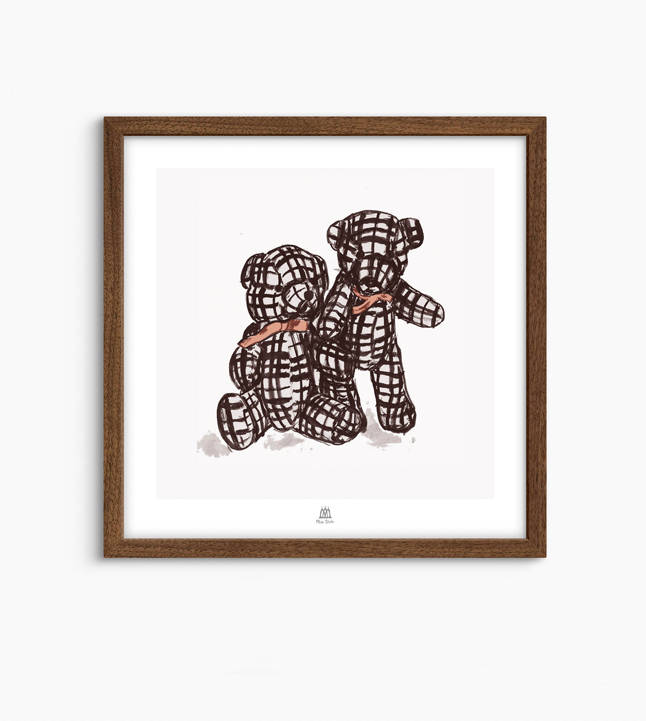 Poster med två rutiga nallar som sitter tätt intill varandra, båda har rosetter runt halsen. Bilden passar både i barnkammaren och i vardagsrummet, tavlan är fint lekfullt målad. Deras allsidighet gör dem till en älskad inredningsdetalj i många olika miljöer.