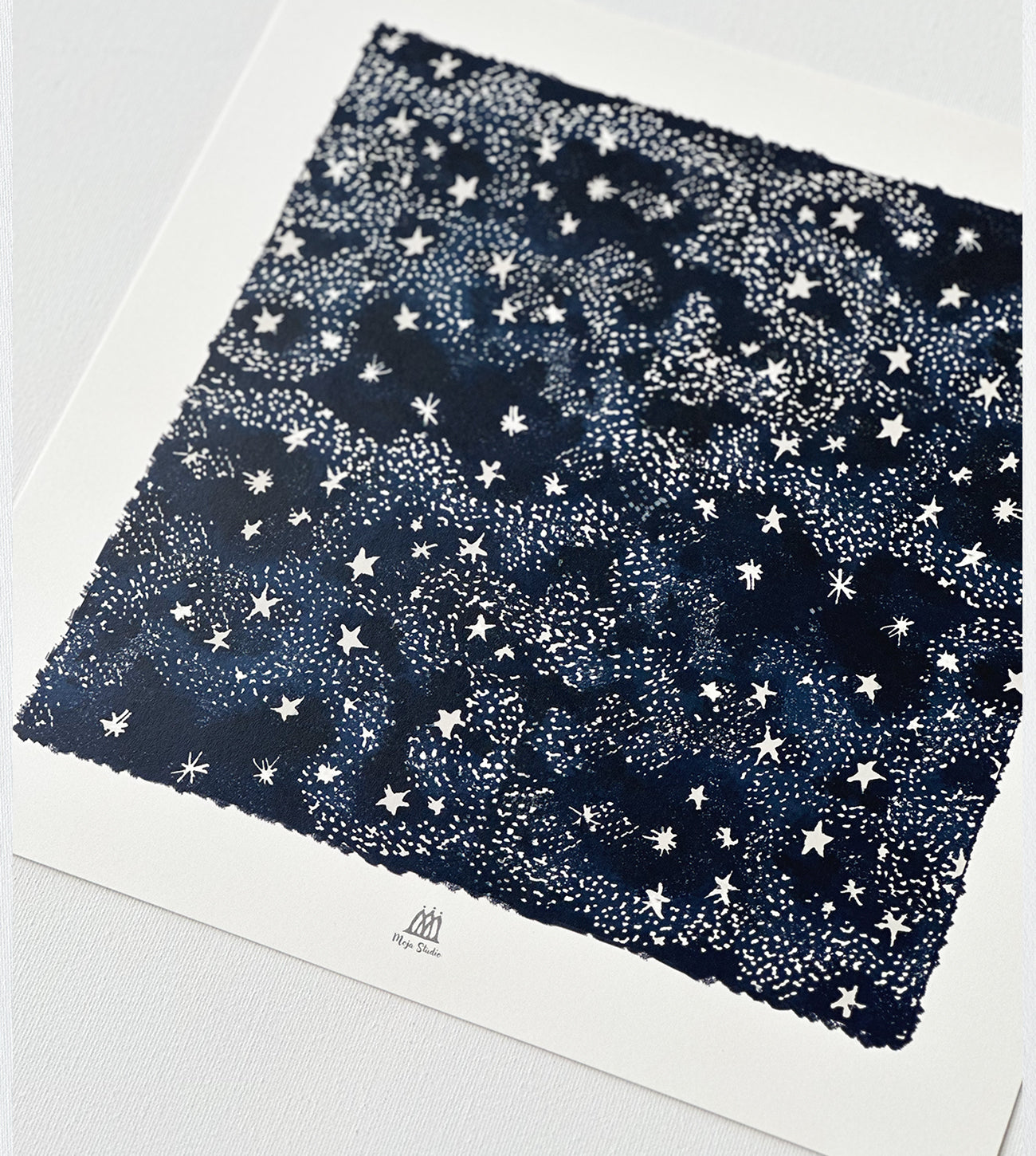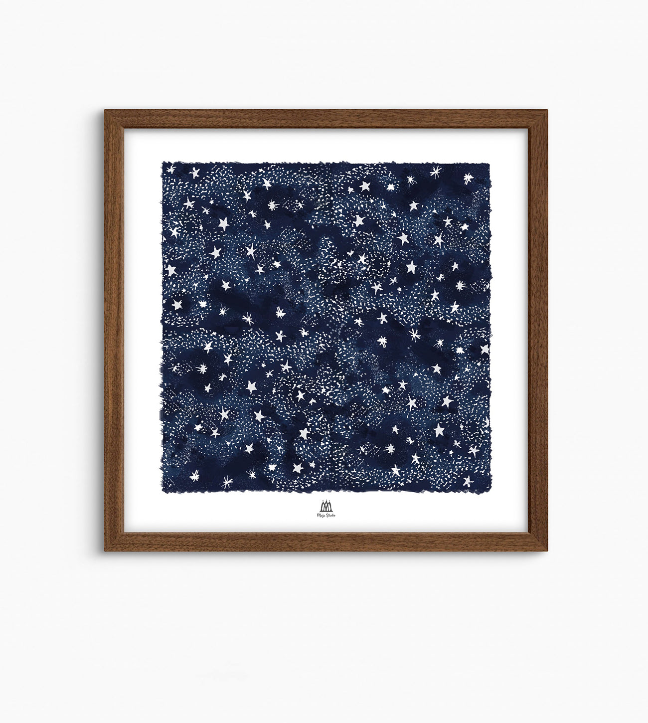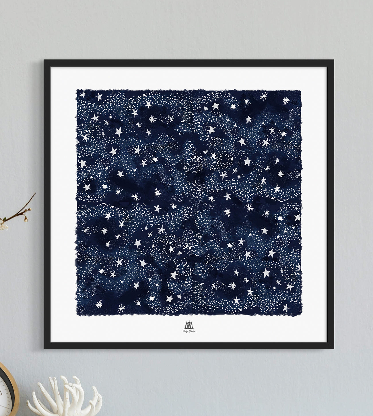 Poster av vår stjärnhimmel, Vintergatan, med vita stjärnor som glittrar mot en mörkblå natthimmel. Tavlan ger en känsla av rymd och nattens lugn. Kontrasten med den vita ramen runt bilden framhäver bilden fint.