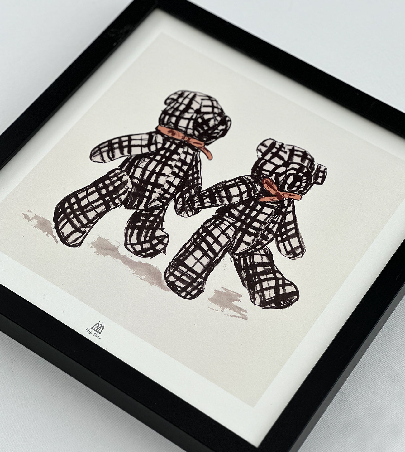 En tuff tavelvägg med klassiska rutiga nallar, en klump och en elefant – stilren men samtidigt rolig i sitt uttryck.