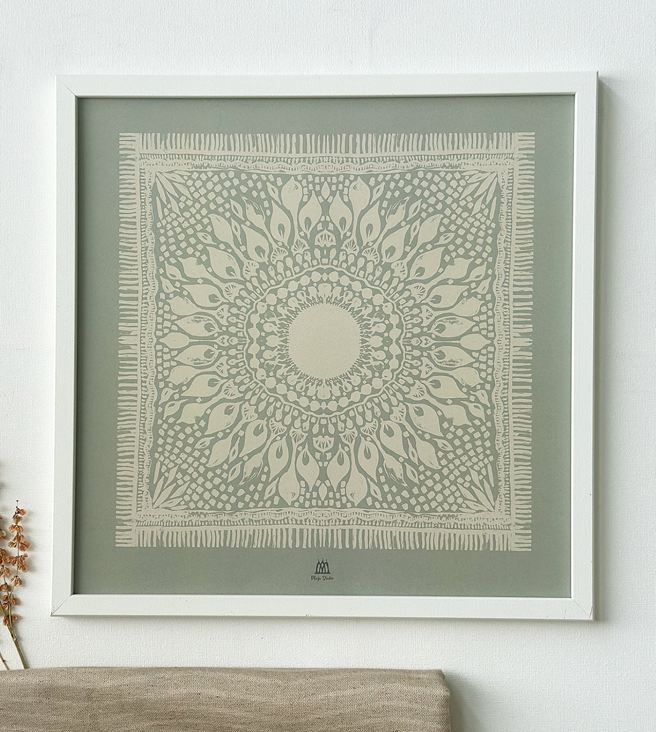 Tavlan Solros i olivgrön färg är en glädjespridare! Med sina vackra mönster fångar den ljuset och ger en varm känsla till ditt hem.